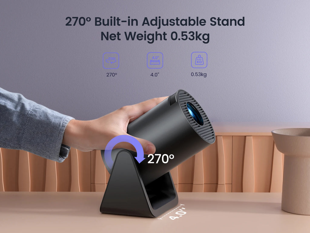 ❥【270°Built-in Stand & All in One Hand】More stable triangular stand, allowing you to effortlessly adjust the angle for the perfect viewing experience. With a net weight of just 0.53kg, small but not simple, instantly project your movie further onto the ceiling. Take it anywhere, and savor high-quality visuals, whether you're indoors or enjoying an outdoor movie night.